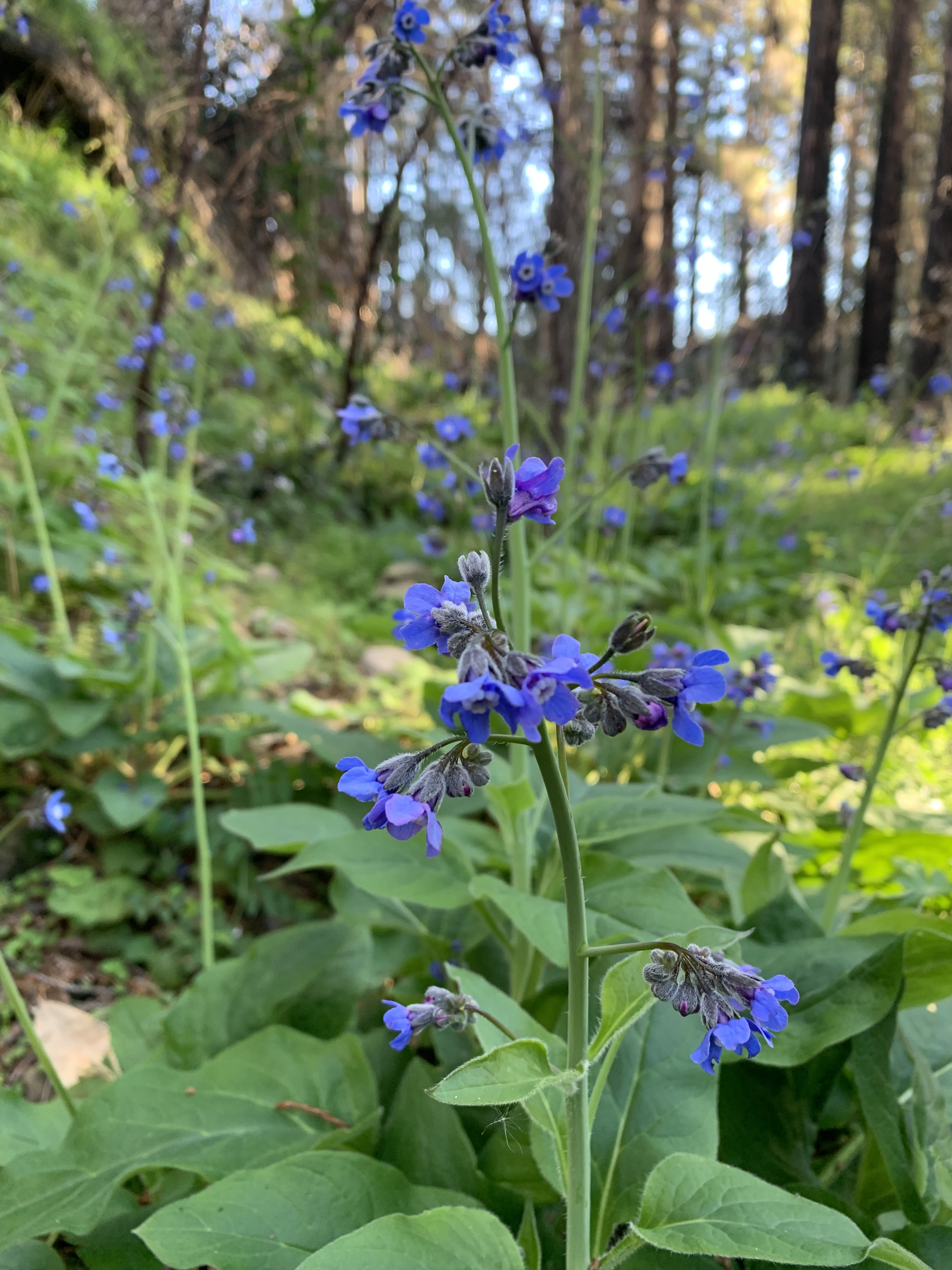 Perhaps named for the pink, in-rolled first leaves emerging from damp leaf litter, hound’s tongue provides the forest’s tallest and brightest blue bouquets. This is a perennial wildflower most commonly found in sunnier patches in forests with oaks and Douglas firs. It must taste bad because I never see it browsed by deer or rodents. A California wildflower book from 1897 says that ‘in the old days’ people thought you could put the leaves under your feet in your shoes and then dogs wouldn’t bark at you. Many gardeners are familiar with a near look-alike relative, borage. The healthiest plants make many flowers, widely spaced on a branching two-foot-tall inflorescence. Today, I saw bumble bees, honeybees, and hover flies visiting the flowers. Bumble bees were especially numerous, and when they latch onto the flowers, which are much smaller than they are, the whole plant bobs and waves, drawing attention from other pollinators. One plant in a hundred produces light purple-pink blossoms instead of the normal blue. This makes me wonder if we are witnessing the blue era of hound’s tongue…maybe one day eons from now, this species will evolve purple or red flowers.