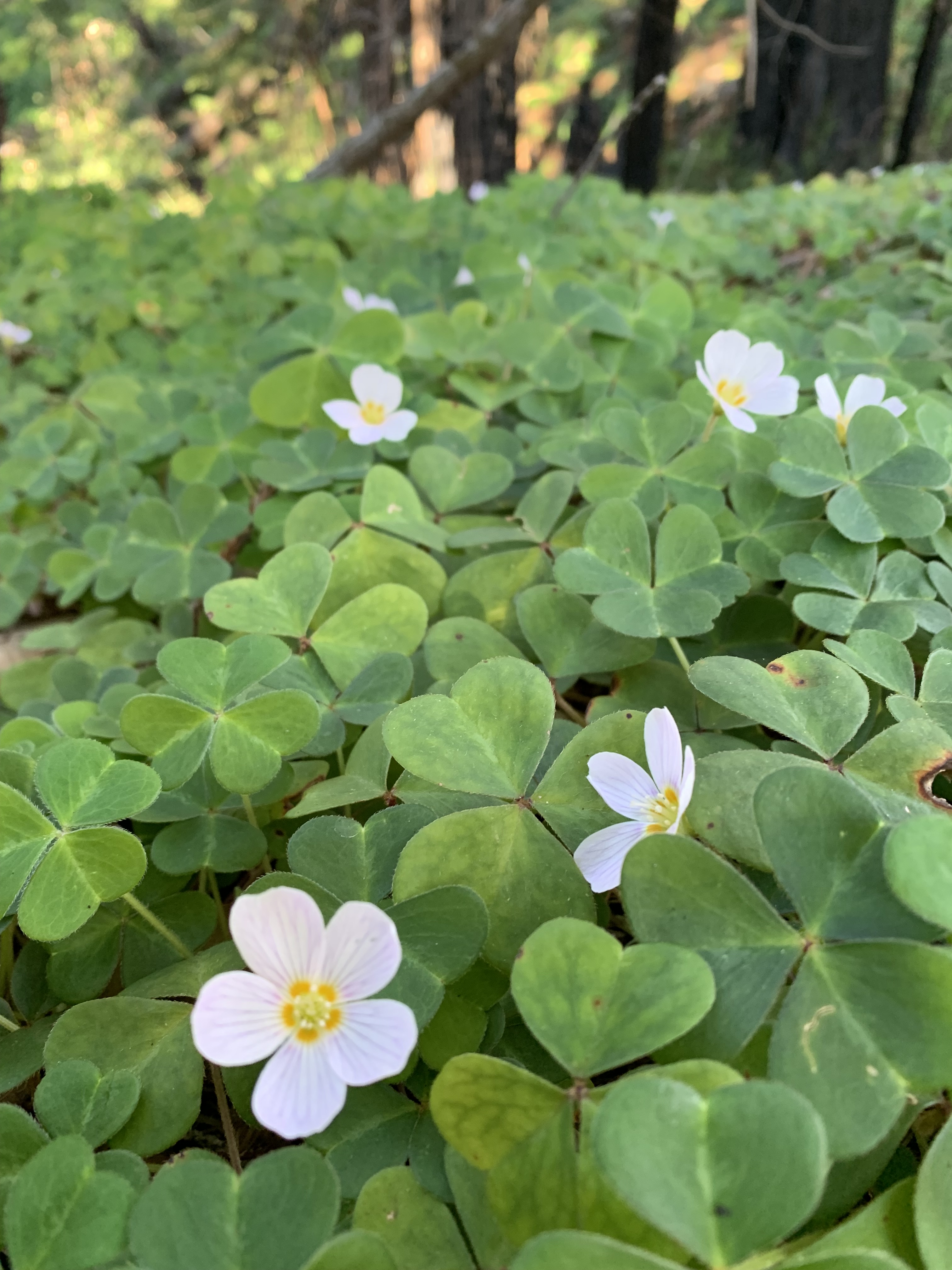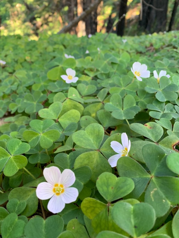 With the recent dry, warm weather, redwood sorrel has started to carpet the redwood forest understory with beautiful pink to white blossoms mixed with its lush medium green, 3-leafleted leaves. Come Saint Patrick’s Day, you might purchase sorrel or see it displayed, but you’ll never find a 4-leaved redwood sorrel (really, shamrocks are clovers, and it is possible to find a four-leaved clover!) In full sun on a hot day, redwood sorrel leaves fold down to keep from roasting. But, in the more typical cool dark understory, each leaflet tilts and turns, orienting independently to maximize light capture with the passing sun rays. The flowers open above the leaves and soon there will be so many redwood sorrel flowers that the forest floor will sparkle like the many stars of the night sky.