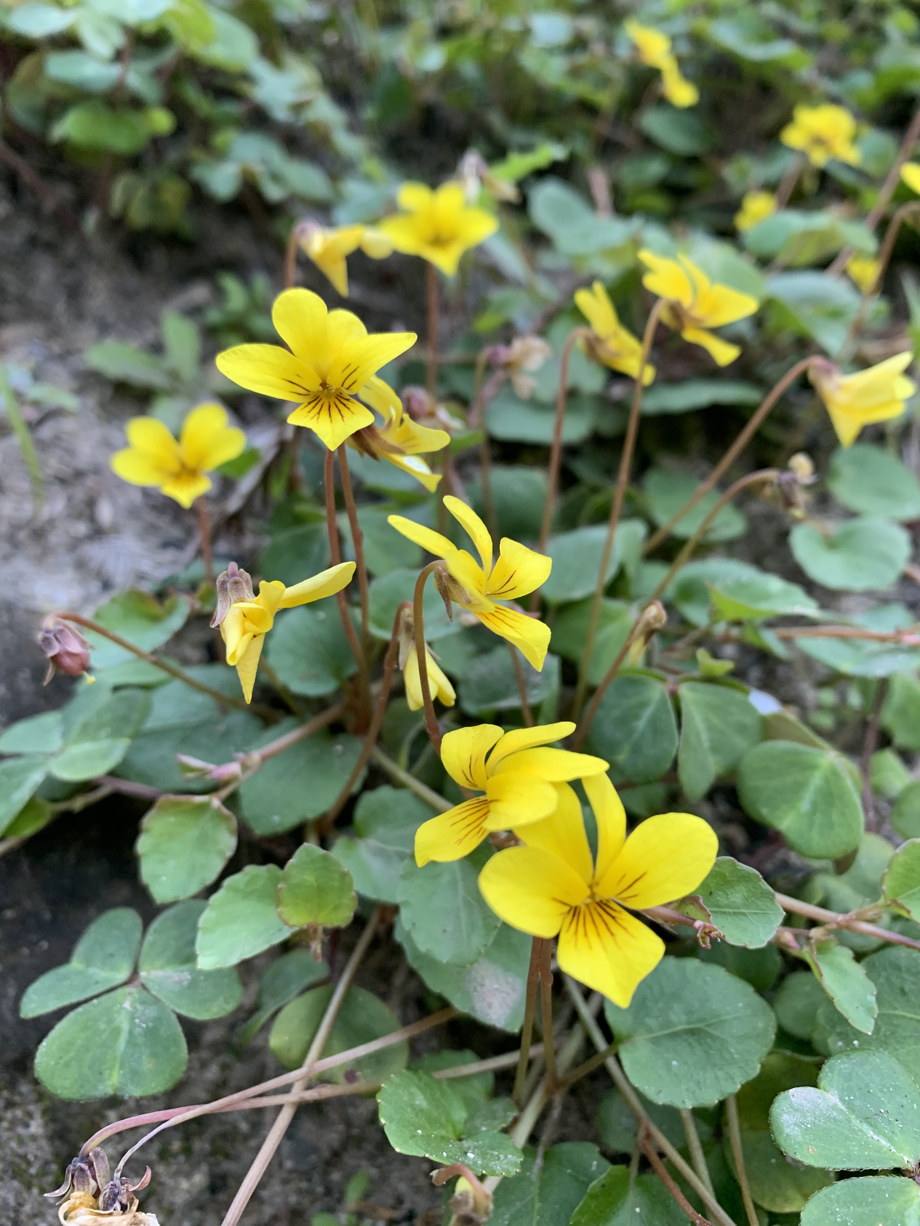 The forest violets have started blooming including my favorite, redwood violet, which makes carpets along banks and on steep slopes in many places near Bonny Doon. Redwood violet has bright yellow flowers that, like redwood sorrel, peek up well above a dense mat of leaves. If you look closely, you’ll see tiny dark red lines in the throat of the flower that lead pollinators to seek rewards inside of the flower. Redwood violet leaves are nearly round, except when you find the telltale sign of the butterfly that feeds on them.