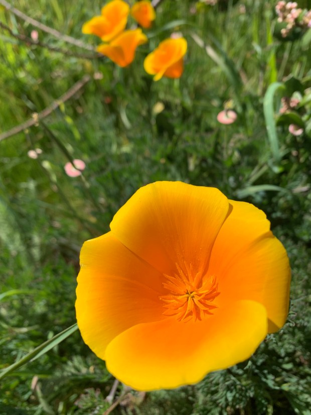 Right on time, the first tulip-sized California poppies have opened. Unusually, and a month early, the sky lupines have started blossoming, as well. The habitat areas, field margins, the hedgerow, and the orchard are starting to fill with Spring blooms. We hope for the return of rain before Spring’s beginning date arrives.