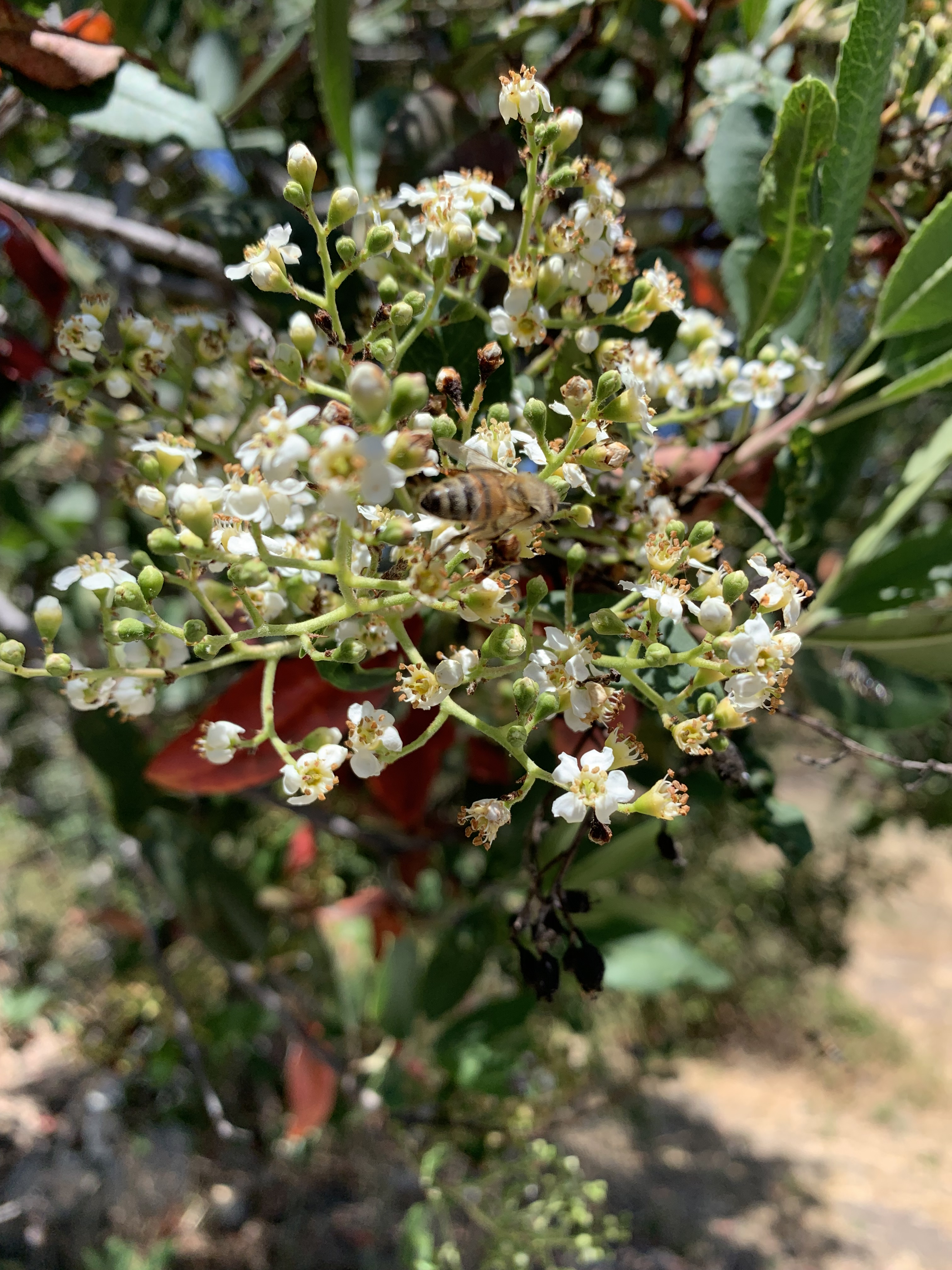 The plant’s genus name “Heteromeles” means ‘different apple’ (“hetero” translates as ‘different’ and “meles” references the apple genus ‘Malus’), which makes sense because this super shrub is related to apples, which are also in the rose family. You can see why it is a rose relative if you examine the small flowers and find that they are five-petaled, like wild roses. I captured a photo of a honeybee visiting Toyon flowers (note the attractive red leaves in the background). Like roses (and apples!) the flowers have an alluring scent…some say like Hawthorn – but, does anyone know how to describe hawthorn smell?? Oh, so much to learn…in Nature, there’s always more to learn.