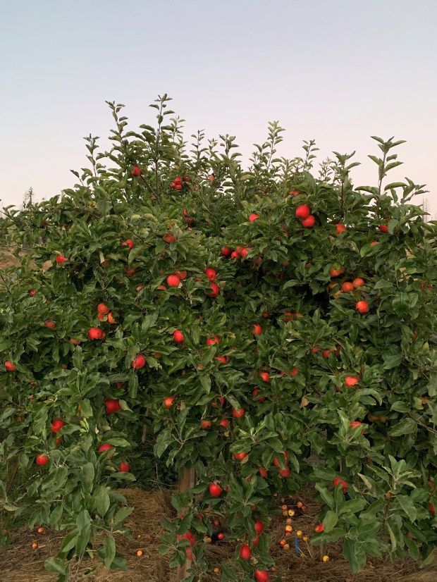 The ripening tomatoes go into buckets only so full. The apples go into shoulder-mounted bags. Both fruit get sorted for sale. Tomatoes of varying quality go for varying prices. Only the perfect apples go to sale, the rest to home use, charity, or juice (cider!). Starting tomorrow, apple harvesters will gather a few times a week and we will be handling 6,000 pounds between now and Thanksgiving. Wow.