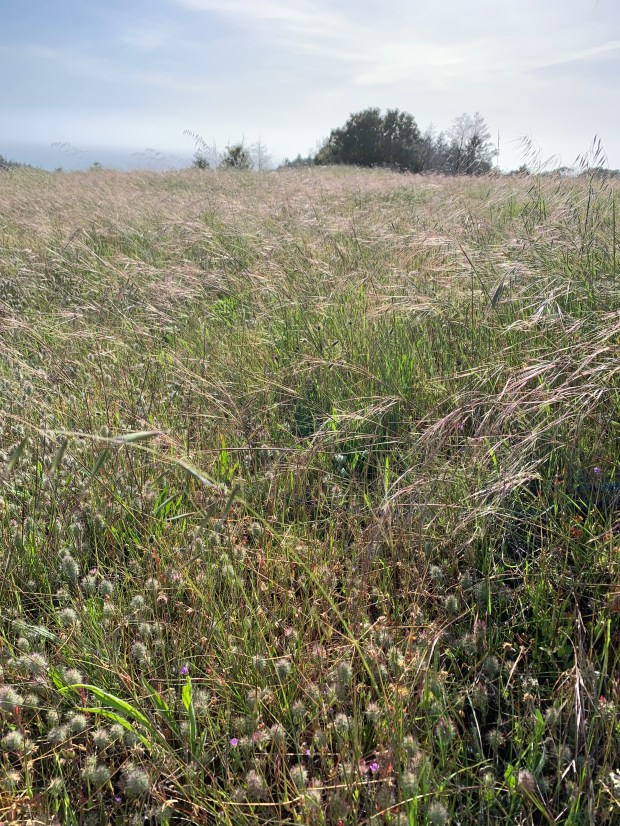 Italian ryegrass has more notoriety: it is the most allergen filled plant known to humankind. The species proliferates with the nitrogen raining down from air pollution, and so lines highways and takes over meadows around the Bay Area. When it blossoms, everyone gets sick- even people who don’t know they have grass allergies report sore throats and coughing for the 2 weeks of its peak bloom. So, invasive non-native grasses are a health hazard – and grassland restoration and management is important for human health.