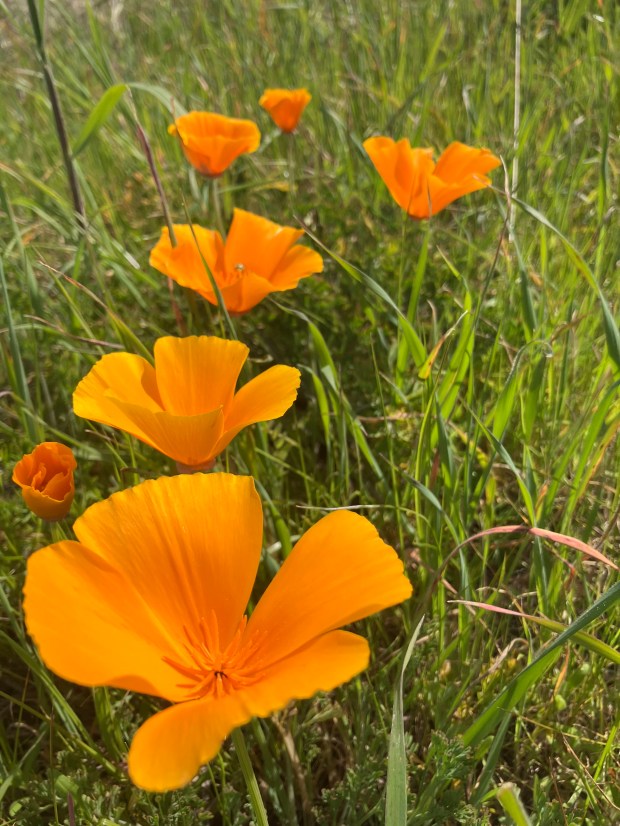 Gopher mounds bristle like alarmed hedgehogs. Although dense, the single first leaves of 2” tall grass seedling spikes haven’t covered the moist, deep brown soil. Ferny blue-green rosettes of California poppy catch droplets that magnify and distort their otherwise tidy appearance. The arched dense cover of perennial grass blades dance and bob in heavy downpours.