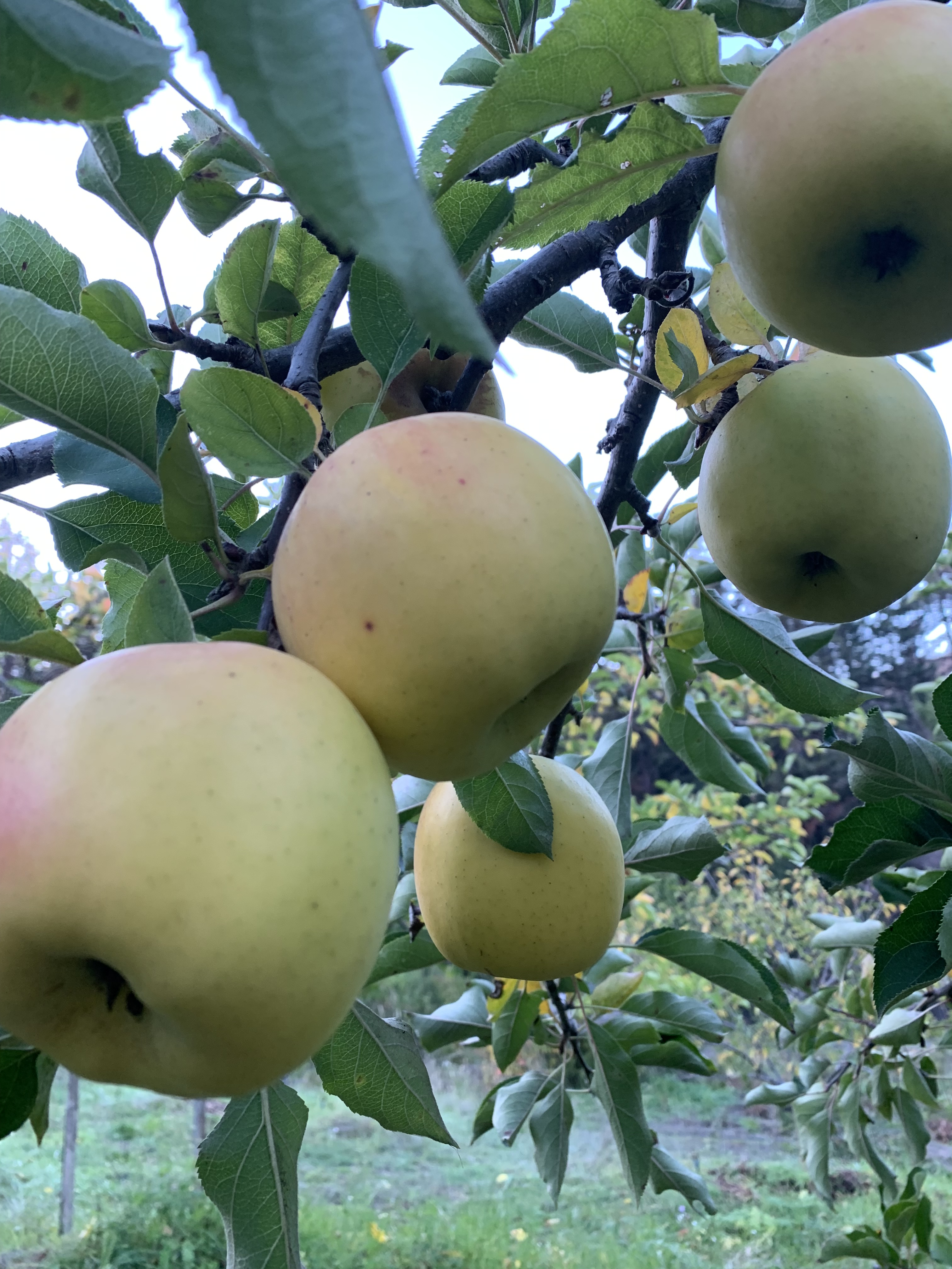 The cider pressing last Saturday attracted 30 or so of our network, new and old pressers, taking the 500 pounds (or more) to 30 (or more) gallons of nectar – delicious juice. Much of this will become hard cider for future gatherings; many enjoyed diverse ciders from prior pressings. Most abundant fruit of this year’s press, Fuji, but also Mutsu which makes famously fine flavored juice. Mixed in here and there were true cider apples, varieties that are just starting to produce after 8 years in the ground. The cider apples add bitterness or sourness or tartness and overall complexity to the juice from what would otherwise be plainer if produced only from table apples.