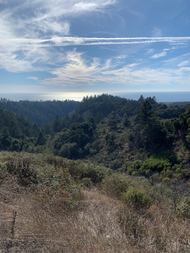 Fall in the wooded canyon means redwoods shedding needle-branches and a rain of seeds from newly opened, small cones. Recent gusts broke loose short sections of the outermost branches from redwood trees. Thin-stemmed branch tips are mostly needles, which are regularly shed this time of year and carpet trails and roads. Even ‘evergreen’ trees shed needles at regular intervals, each species with its own season. And so, the forest floor transforms from last year’s now dark duff to a light, red-brown coating of fresh redwood litter. Walking our Molino Creek Canyon trail now creates a crunchy, crackly sound. On a recent walk, I glanced down to appreciate the redwood fall and saw many redwood seeds sprinkled between the scattered needle branches. A heavy breeze swayed the trees back and forth over me and in all directions, and the air was suddenly filled with redwood seeds, bigger than dust and thickly moving like sheets of drizzle.