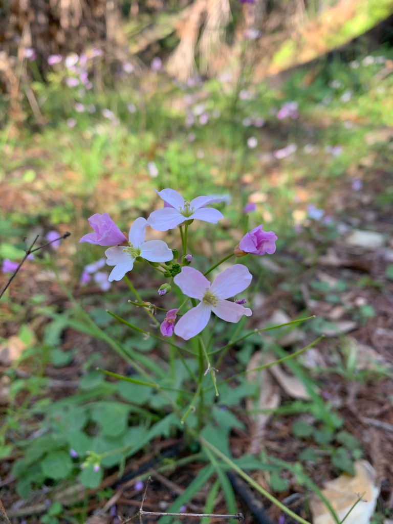 Another white to pink early spring forest flower is in full bloom right now, growing on the edge of patches of redwood and out into Douglas fir and oak groves. Milk maids is a relative of cress and has bright 4-petaled flowers, normally quite white (but ones near my house are quite pink). The description of this plant from the aforementioned 1897 book by Mary Parsons ‘The Wild Flowers of California’ deserves quoting: