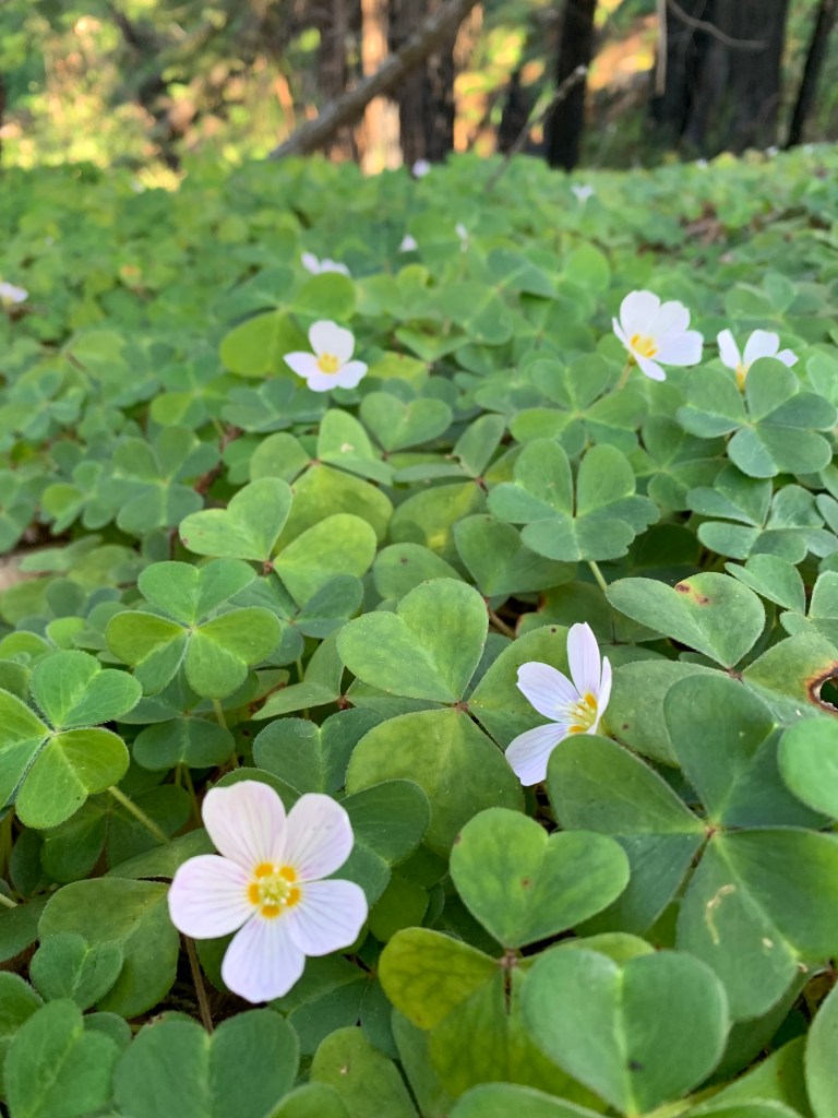 With the recent dry, warm weather, redwood sorrel has started to carpet the redwood forest understory with beautiful pink to white blossoms mixed with its lush medium green, 3-leafleted leaves. Come Saint Patrick’s Day, you might purchase sorrel or see it displayed, but you’ll never find a 4-leaved redwood sorrel (really, shamrocks are clovers, and it is possible to find a four-leaved clover!) In full sun on a hot day, redwood sorrel leaves fold down to keep from roasting. But, in the more typical cool dark understory, each leaflet tilts and turns, orienting independently to maximize light capture with the passing sun rays. The flowers open above the leaves and soon there will be so many redwood sorrel flowers that the forest floor will sparkle like the many stars of the night sky.